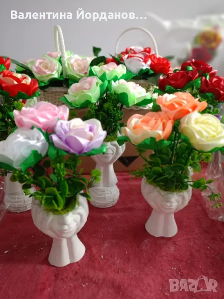 ръчно изработени гипсови кашпи и сатенени цветя 15 лв бр. доставка с Еконт или Спиди