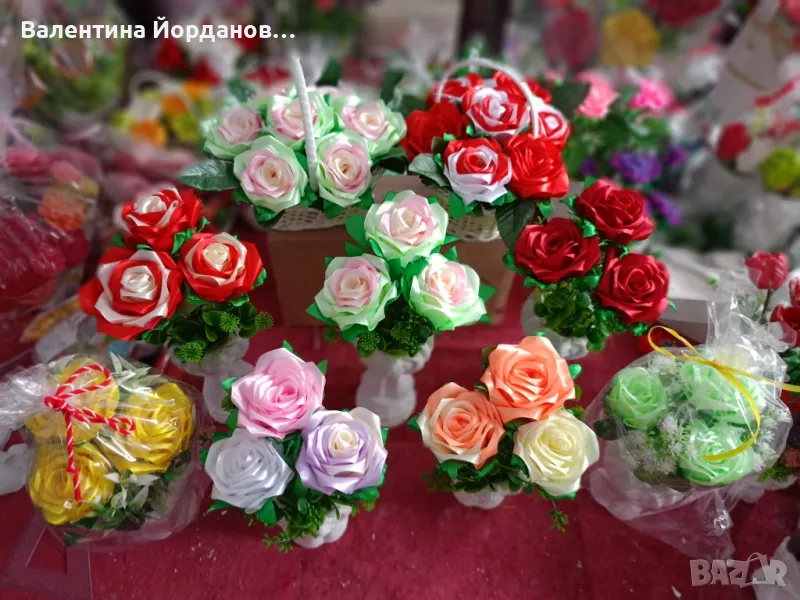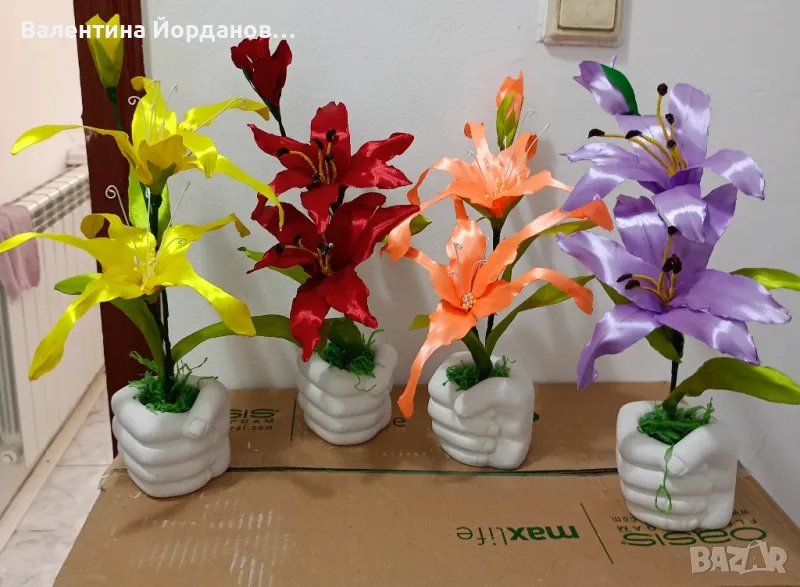 ръчно изработени кашпи и цветя от сатенени ленти → Обява 49156769