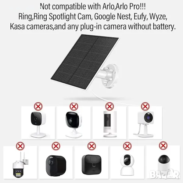 Съвместим с DC 5V външна камера с акумулаторна батерия с Micro USB или USB-C порт: 5w соларен панел, съвместим с DC 5V външна камера с акумулаторна батерия с Micro USB или USB -C порт камера, Не е съвместим с Arlo, Arlo Pro!!!, Камери Ring, Ring Spotlight Cam, Google Nest, Eufy, Wyze, Kasa и всякакви допълнителни камери без батерия. Моля, прочетете внимателно нашето описание, преди да направите поръчка.