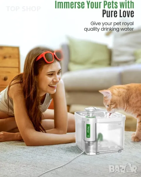Фонтан за пиене от човешки клас: Този фонтан за пиене на котки е идеален за котки и малки кучета и предлага пречистване от човешки клас, за да поддържа вашия домашен любимец хидратиран, активен, здрав и защитен. С технологията за пречистване от човешки клас водата е напълно чиста, така че не е нужно да се притеснявате за нечиста вода в купата на вашия домашен любимец.
