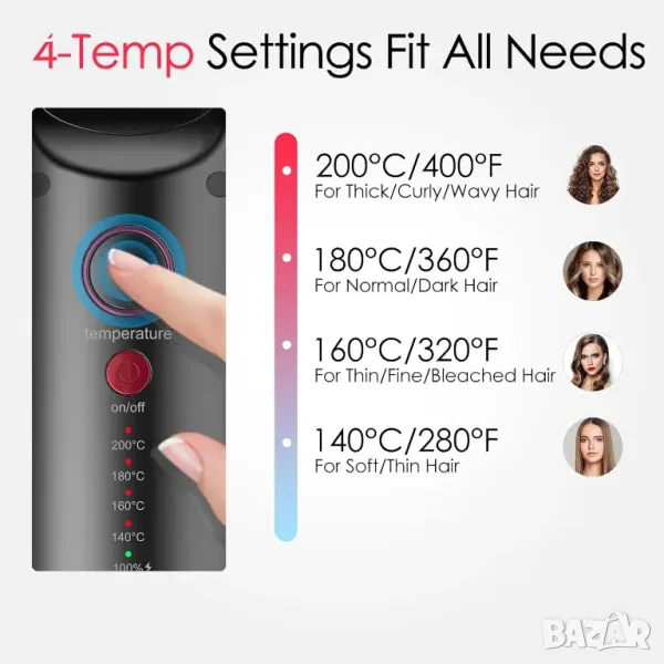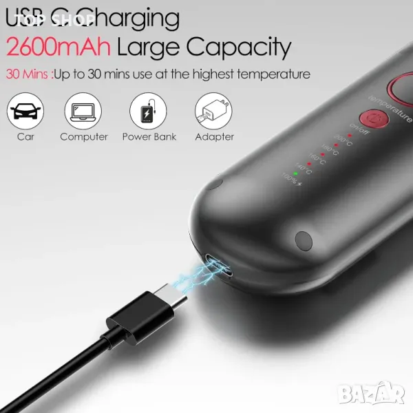 USB-C акумулаторна и едно зареждане за 2-3 употреби--- Тази работеща с батерии преса за коса има вградена батерия от 5000 mAh. Време за зареждане от 2 часа и време за използване от 30 минути при зададена най-висока температура показва, че е достатъчно голям за множество приложения.