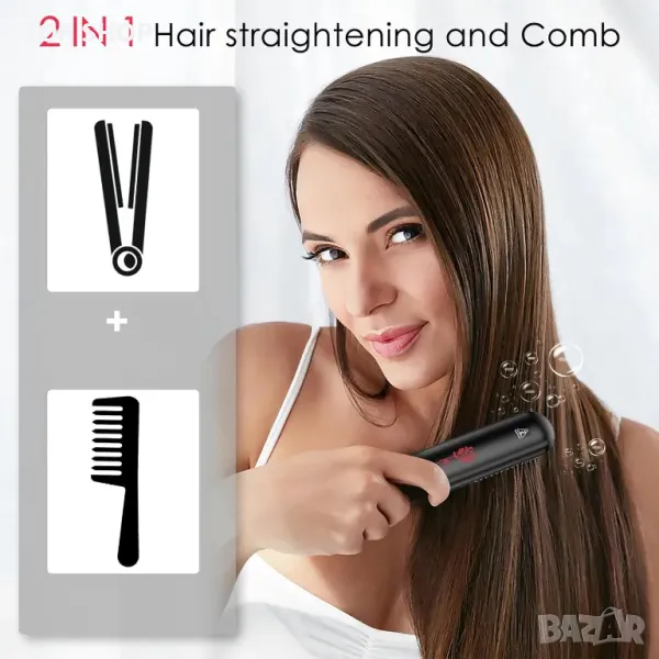 Носете оформянето на косата си навсякъде -- Зъбците на гребена са покрити с керамичен материал, който може да намали триенето с 50%, като по този начин намалява увреждането на косата и прави косата да изглежда по-гладка и без къдрене. И в сравнение с други подобни продукти, този гребен е не само лесно подходящ за тънка коса, но и удобен за дълга и гъста коса поради удължените зъби на гребена. НЯМА функция сешоар.