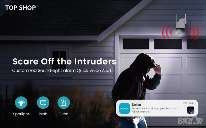 Интелигентно проследяване на движение --- Проследяването на движение позволява на външната охранителна камера на DEKCO да открива обект в движение. Веднъж активирана, охранителната камера ще започне автоматично да записва и проследява обект в движение. След като бъде засечено движение, ще получавате сигнали директно от приложението на вашето IOS/Android устройство.