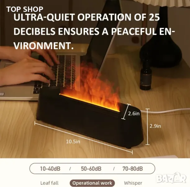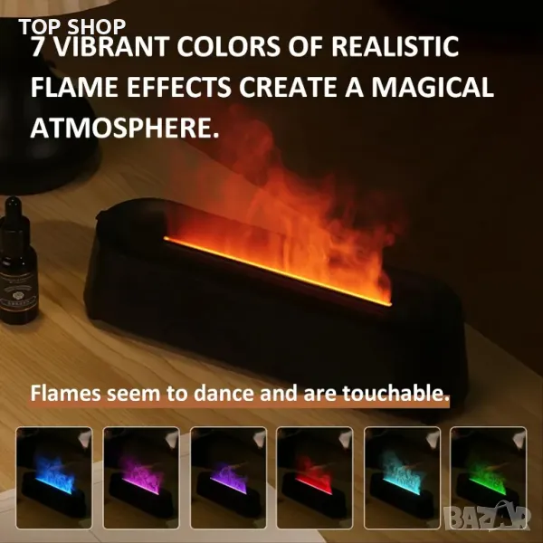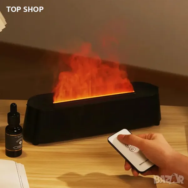 Овлажнител с дифузьор на пламък: Този дифузер с етерично масло е многофункционално устройство за ароматерапия, което работи също като овлажнител на въздуха и нощна светлина.