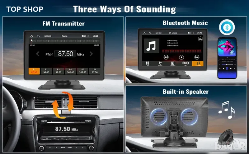 Три аудио режима: Вградено аудио, FM безжична връзка към аудиосистемата на автомобила, Вградена Bluetooth функция, може да се свързва с мобилни телефони, разговори със свободни ръце, по-безопасно шофиране, Bluetooth възпроизвеждане на музика.