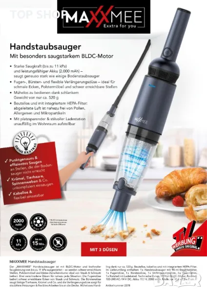Това е удобният захранващ блок за вашето домакинство. Ръчната прахосмукачка MAXXMEE е оборудвана с BLDC мотор и мощна всмукателна мощност до 11 kPa - така прахът и мръсотията се отстраняват идеално от труднодостъпни места, мека мебел и малки пространства. Трите различни дюзи осигуряват подкрепа в почти всяка ситуация: дюзата за цепнатини надеждно премахва прах и мръсотия от труднодостъпните ъгли. Накрайникът с четка лесно изсмуква досадните животински косми, трохи и др. от мека мебел, а удължителният накрайник осигурява нагряване без прах и гъвкава работа чак до тавана. Лекото тегло от само около 520 g осигурява лесно боравене. Ръчната прахосмукачка MAXXMEE е без торба, безжична и с интегриран HEPA филтър, идеалният спътник за въздух в стаята без прах и полени.