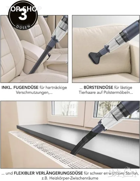 Ръчната прахосмукачка MAXXMEE е снабдена с 3 различни дюзи, за да можете надеждно и прецизно да премахвате животински косми, паяжини и други подобни. Накрайникът за цепнатини, накрайникът с четка и гъвкавият накрайник за удължаване ви дават точно гъвкавостта, от която се нуждаете.