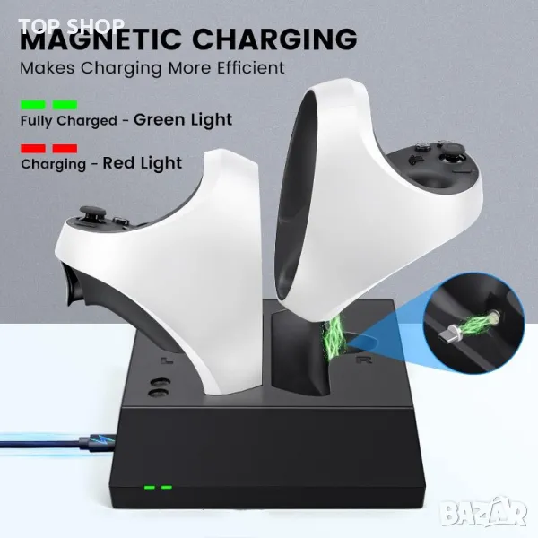 【LED индикатор за зареждане】 - Различни цветни LED светлини се използват за индикация на състоянието на зареждане на контролерите. При зареждане на контролера PSVR2 ще се появи червена светлина; когато е напълно зареден или в режим на готовност, ще се появи зелена светлина.