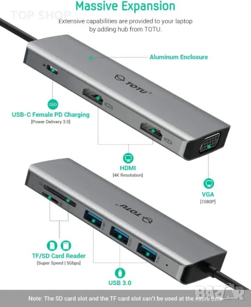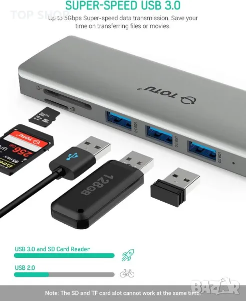 Тънък и преносим дизайн: TOTU USB Type C Hub има готов за работа дизайн. С алуминиев външен вид и само 2,48 Oz, можете просто да го поставите в джоба си и е идеален за бизнес пътуване или пътуване.