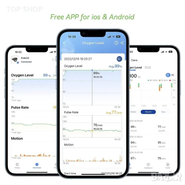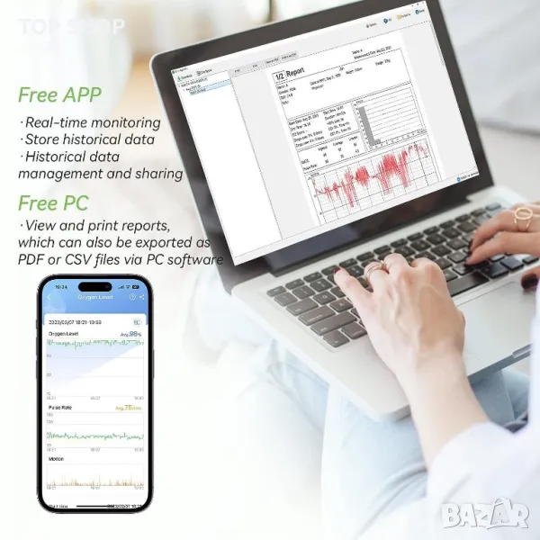 Безплатно ПРИЛОЖЕНИЕ и компютърен софтуер: Синхронизирайте данните с вашия смарт телефон или компютър, познавайте общите тенденции чрез графика, наблюдавайте подробни показания с лупа. Споделяне с едно щракване от APP, PDF/CSV за експортиране от компютър, удобно споделяне на вашия отчет.