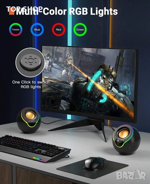 Контролируеми цветни RGB светлини - Компютърният високоговорител добавя 4 RGB светлинни режима, лесно щракнете, за да превключите или затворите по желание. Студените цветни RGB светлини внасят страстна атмосфера във вашите игри.