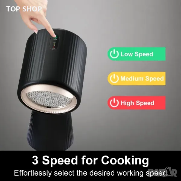 Лесен за работа: Функция Plug-and-play, просто включете преносимия аспиратор и докоснете осветения бутон, за да го включите и изключите и изберете между 3 нива на мощност, не е необходима инсталация. Независимо дали готвите бавно ястие или приготвяте ястие при високи температури, нашите абсорбатори се настройват безпроблемно.