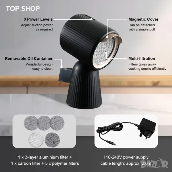 Обхват на доставката: Включва универсален настолен черен аспиратор, 3 x полимерни филтри, 1 x миещ се алуминиев филтър, 1 x въглероден филтър, кабел с дължина 2,0 m. Размер на продукта: 17 x 23,5 x 35,8 cm (Ш x Д x В)