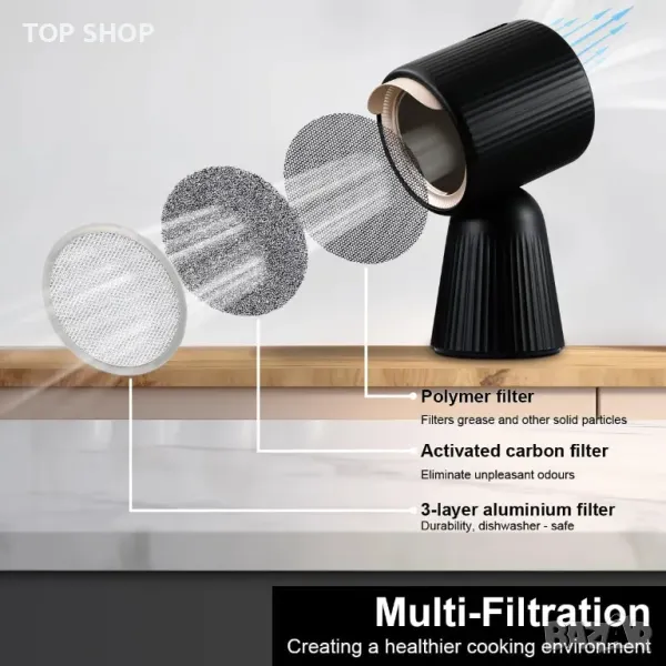 Технология за много филтриране: Мини абсорбатор с няколко подвижни филтъра, високоефективен полимерен филтър, миещ се 3-слоен алуминиев филтър и висококачествен въглероден филтър. Ефективно улавя по-големите частици мазнини и остатъците от храна, неутрализира миризмите, поддържайки чиста, свежа и здравословна среда за готвене. (Филтър с активен въглен и алуминиев филтър могат да бъдат закупени отделно, продукт № YYCF-MH02)