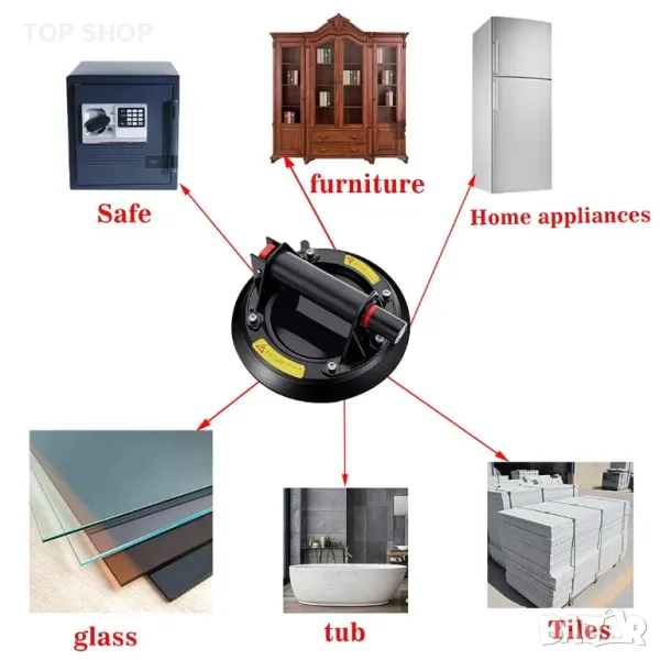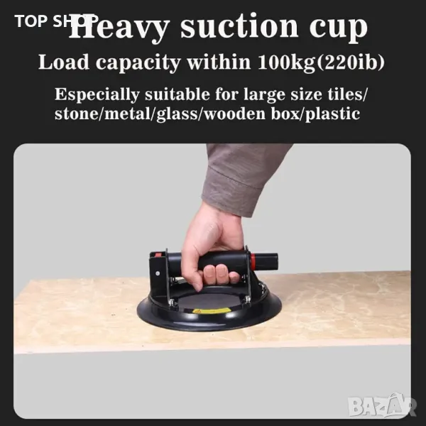 Капацитет на натоварване в рамките на 100 kg (220 lb): силна вакуумна вендуза може да издържи 100 kg (220 lb) от всяка вендуза вертикално. Ако стоките са тежки, броят на вендузите може да се конфигурира, за да разпредели равномерно натоварването. Подходящ е за гладки повърхности, особено големи стъклени повърхности, керамични плочки, дървени подове, камък, гипсокартон, мебели, метал, пластмаса и други гладки повърхности