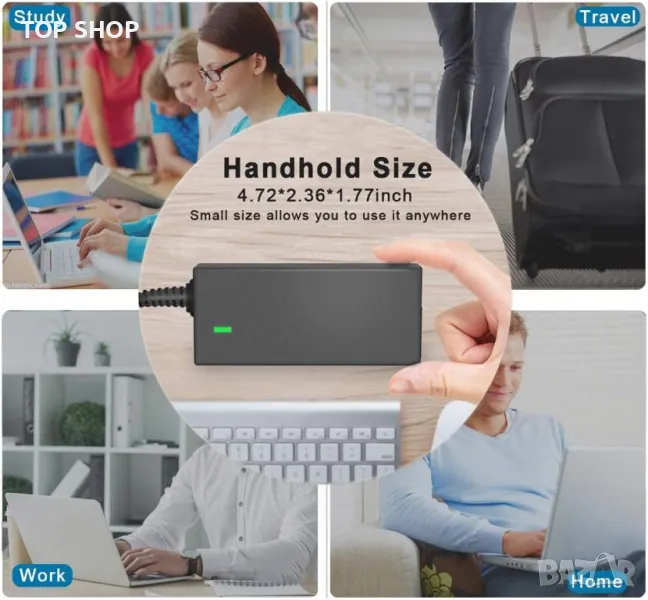 100% чисто нов, DC-изход: 19V~3.42A~65W; Вход: 100-240V ~ 1,2 A 50/60 Hz; Размер на конектора за постоянен ток: Вътрешен диаметър: 1,1 mm, Външен диаметър: 3,0 mm