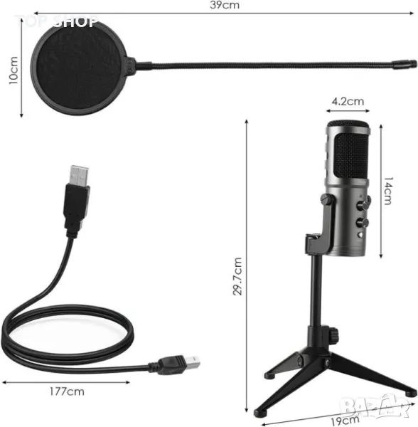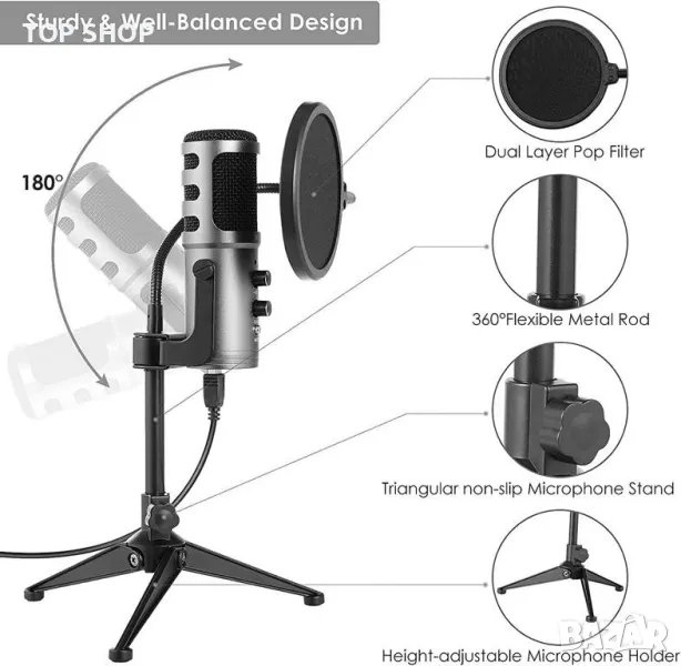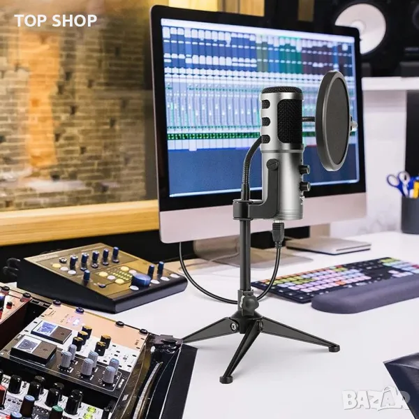 USB кондензаторен микрофон със статив и поп филтър111 от Mugig K58 >70dB, 5V, → Обява 49160916