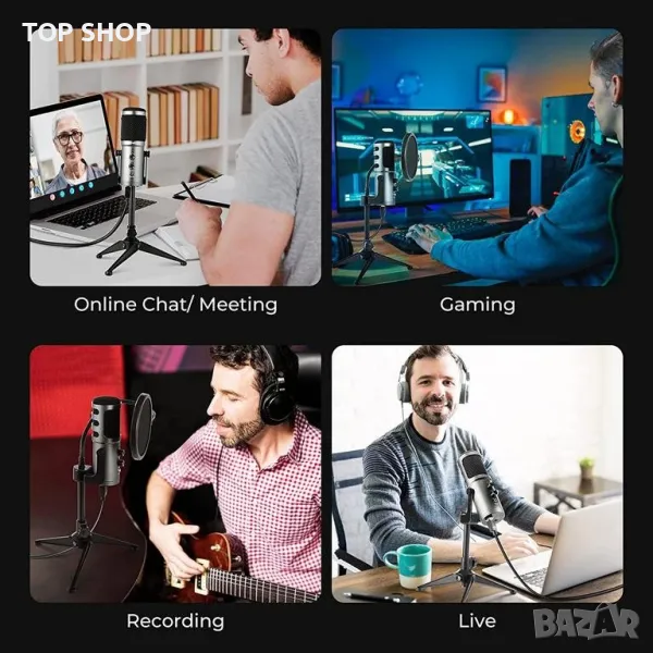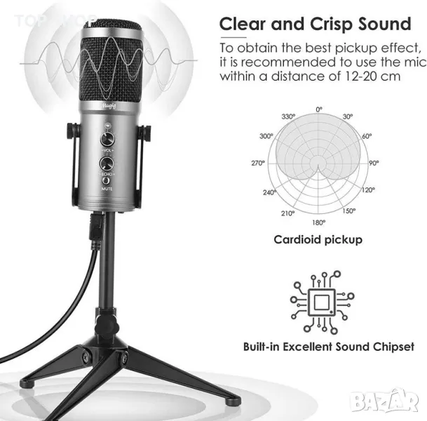 USB кондензаторен микрофон със статив и поп филтър от Mugig. Този кондензаторен микрофон е подходящ за вокали, игри, музикални инструменти или чатове/срещи на живо. Може да се свързва чрез USB и работи с всички Windows и MacOS устройства без драйвер. Самият микрофон има контроли за сила на звука, ECHO и заглушаване. Интегриран е и изход за слушалки. За постигане на най-добър ефект се препоръчва разстояние от 12-20 см.