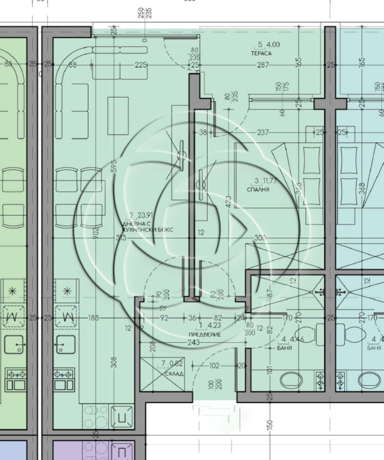 Разпределение: Хол с кухненски бокс, спалня, антре, санитарно помещение, склад, тераса.