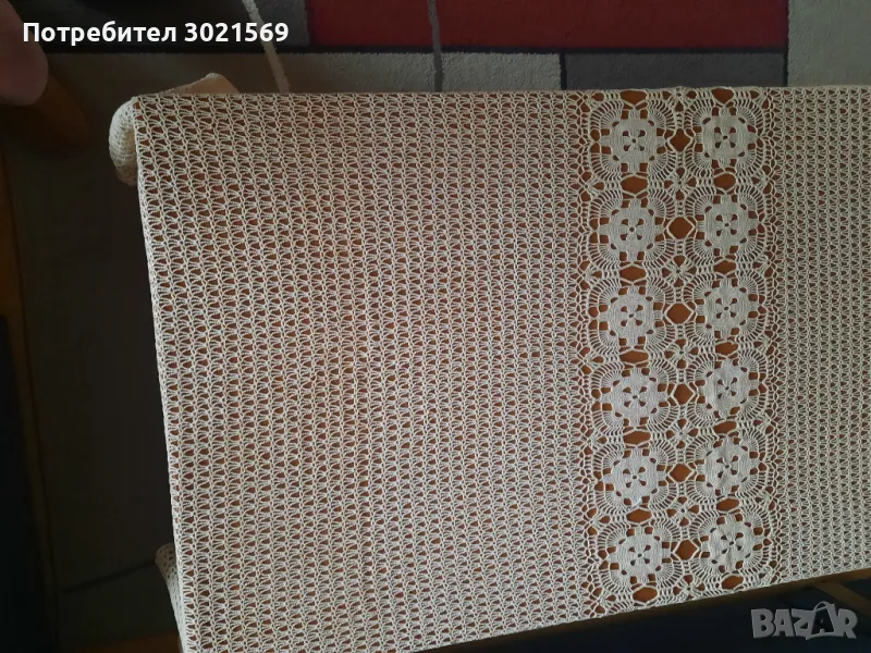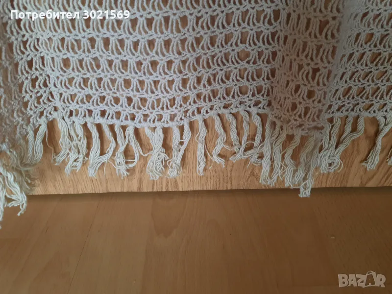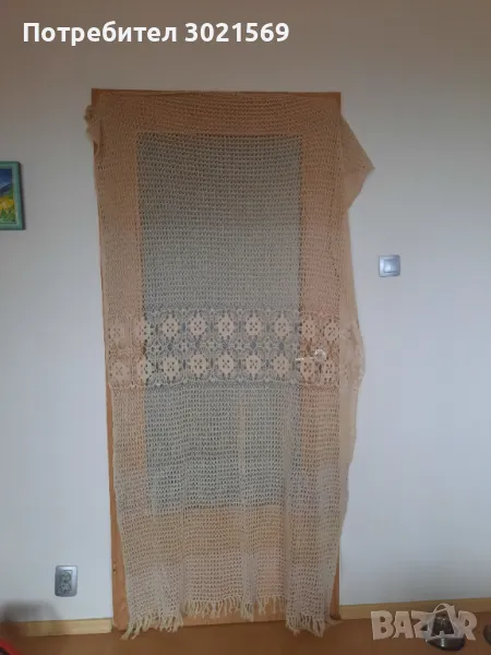 Ръчно плетено перде на една кука. В горния край трябва да се зашие перделък за да не се разтяга при закачване.
