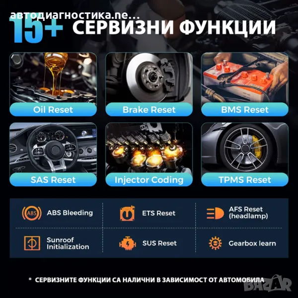 Много удобно и лесно за работа. Поддръжка на над 120+ марки автомобили и 15 сервизни функции: Oil reset, EPB reset, BMS reset, SAS reset, TPMS reset, ABS reset, DPF regeneration, Injector coding, Anti-Theft, Throttle sensor relearn, Air Suspension reset, AFS reset, EGR reset, Gear Learning, Sunroof reset