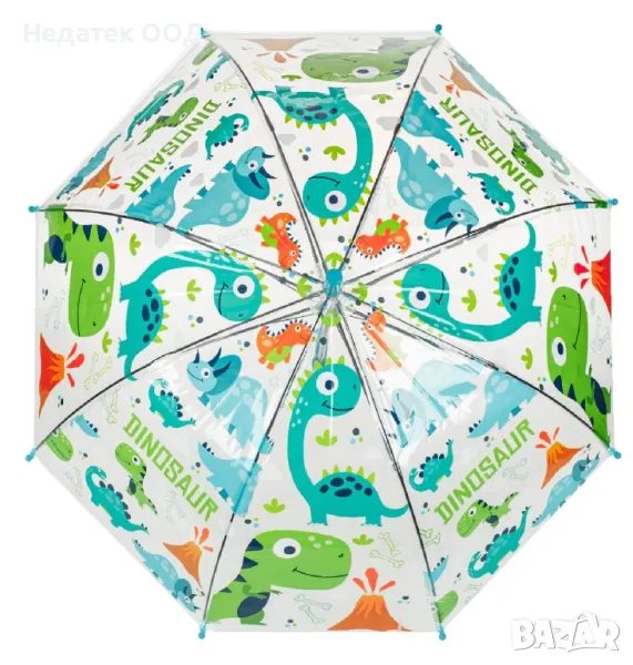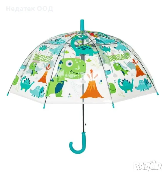 Прозрачен чадър за дъжд за момче в ярко син цвят с дизайн на динозавър. Има извита дръжка и механизъм за автоматично отваряне.