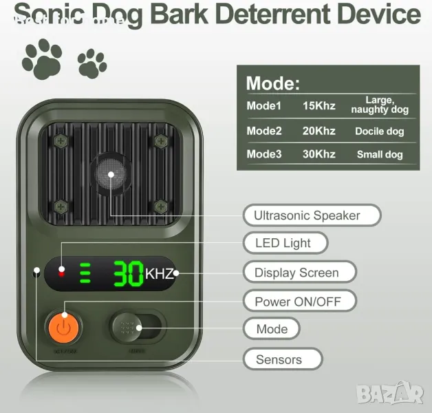 【3 регулируеми режима】: Нашето устройство за контрол на лаенето има три регулируеми режима, Режим 1 (15-30kHz): променлива честота, подходящ за палави или големи кучета, Режим 2 (20kHz): по-подходящ за нежни кучета и Режим 3 (30kHz): по-подходящ за малки кучета. Независимо дали имате нужда от нежни напомняния за леко лаещи кучета или от по-силно възпиране за упорити лаещи кучета, нашата запушалка за лаене може да отговори на вашите нужди.
