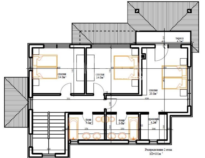 Първи етаж - дневна с кухненска част, спалня, баня с тоалет и южна веранда. Втори етаж - три спални, две бани, дрешник, южна панорамна тераса. Едната спалня разполага с баня, тоалетна и дрешник. Къщата е изградена с висококачествени материали. Парцела е с правилна форма и площ от 600 кв.м