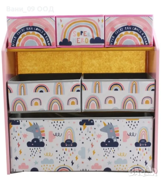 Розова детска етажерка с модерен и практичен дизайн, насърчаваща децата да подреждат след себе си.