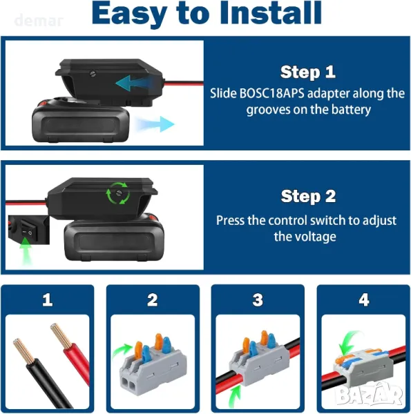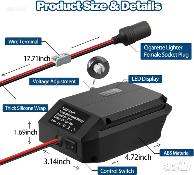 Съвместим с 18V PBA батерии на Bosch, този понижаващ преобразувател осигурява стабилно захранване от 18V към 12V за различни автомобилни приложения. Той разполага с регулиран вход (15V-21V) и регулируем изход (5V-13V, макс. 10A) с клемен блок и конектор за запалка. Вградената защита срещу свръхток, късо съединение и предпазител гарантират безопасност, докато висококачественото силиконово медно окабеляване и топлоустойчивият проводник 14 AWG поддържат до 10 A. Компактен и преносим, той е идеален за захранване на автомобилни аксесоари и устройства за зареждане по време на пътувания или приключения на открито. Пакетът включва един DIY адаптер (батерията не е включена).