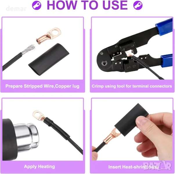 DMiotech 12 бр. 4/0 AWG - 5/16" медни кабелни накрайници, с 12 бр. термосвиваеми тръби