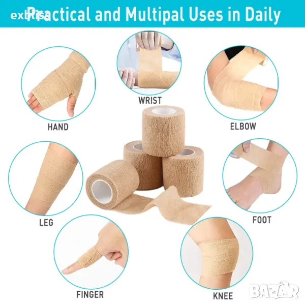- Самозалепващи се: Лесни за употреба, без нужда от допълнителни закопчалки или щипки. Просто увийте бинта около засегнатата зона и той ще се залепи здраво за себе си.