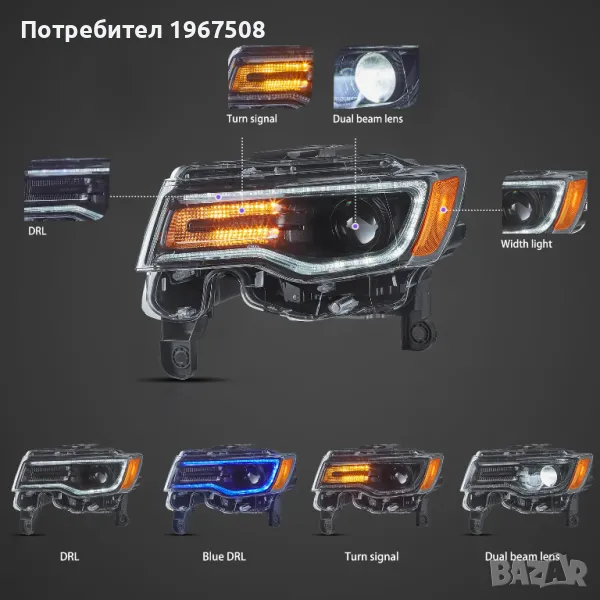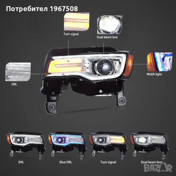 Комплект LED фарове за Grand Cherokee WK2 2014-2022 с начална синя анимация на DRL-а.