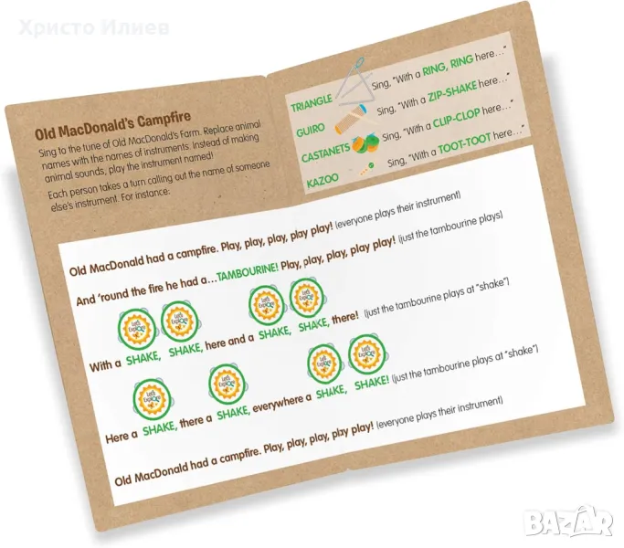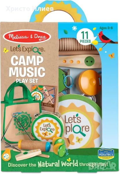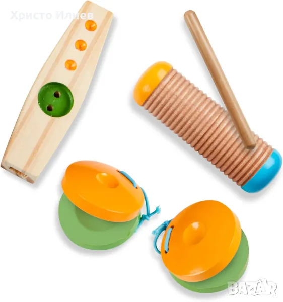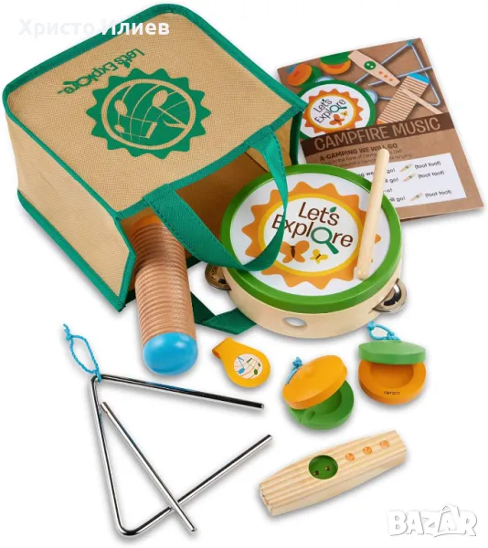 Комплект от дървени и метални инструменти, с които ще създадете истинска музика и забавление. Всички инструменти ще можете удобно да пренасяте в красива торбичка от плат с дръжки.