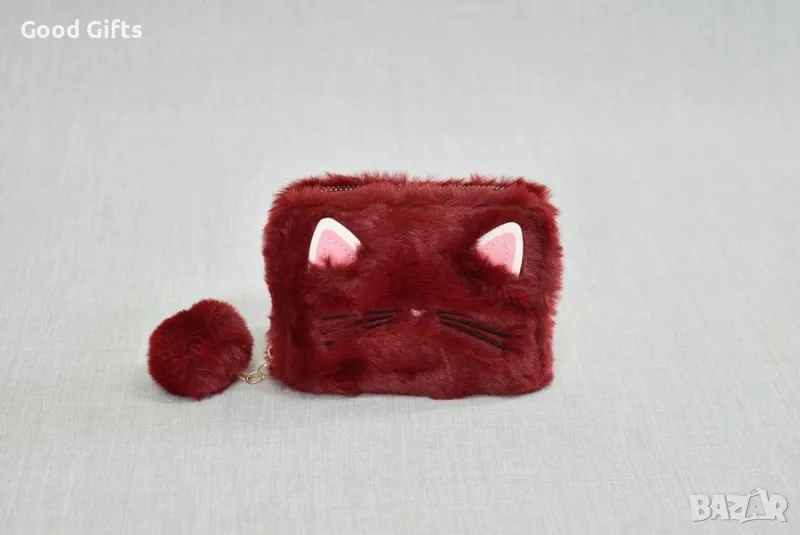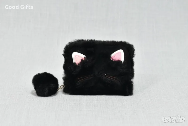 Малко портмоне от текстил с формата на коте, красиво и пухкаво, с висулка помпон.