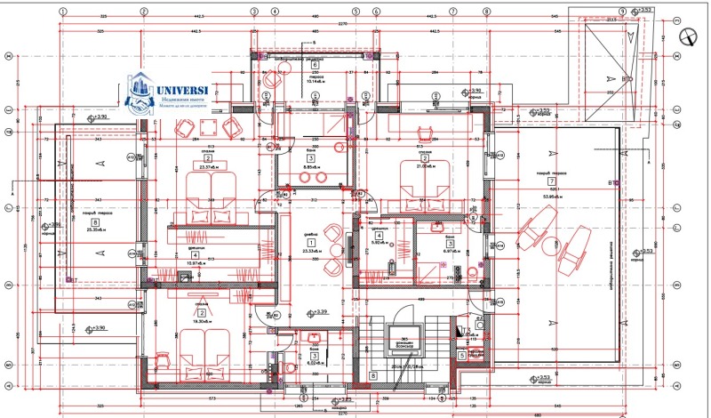 Върху площ от 808м2 са развити четири нива, всяко от които с максимално рационално усвоена площ, без никакви паразитни пространства.