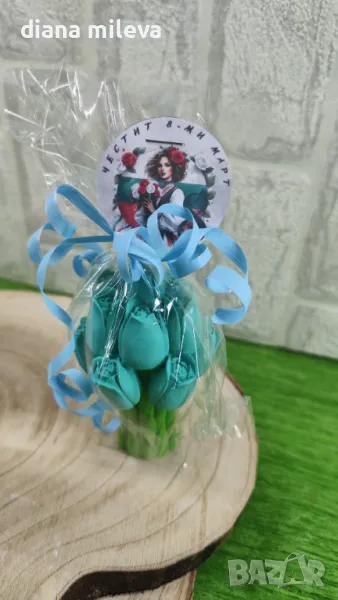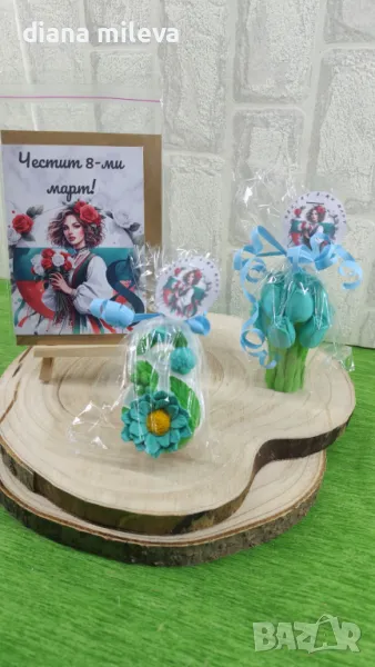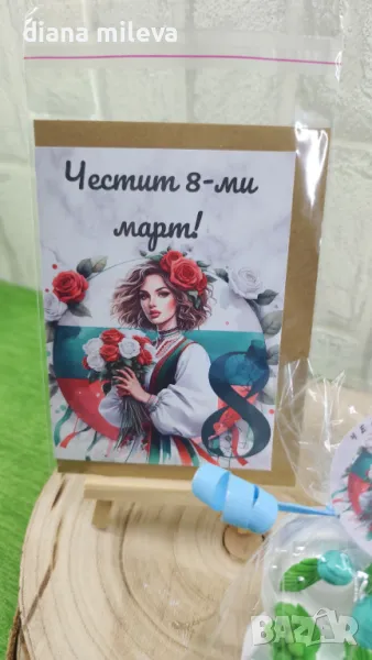 Комплектът включва картичка и гипсокерамични лалета и осмица, стилно опаковани в специална кутия с панделка, която е готова за подаряване!!!