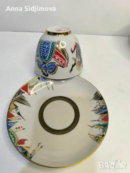 Автор А. Ларионов. 1983 г. Порцелан, живопис, позлата. Височина 6,8 см. Диаметър на чинийката 14,5см.На златния кант на чинийката незначително поизтриване.