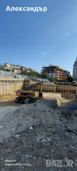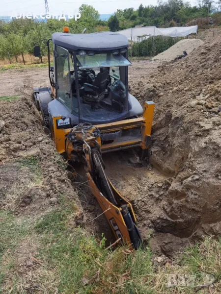 - Колесен 18-тонен багер Catterpilar. С тритялова стрела, хидравличен бързосменик, линия за хидрочук, изкопн кофа с ширина 120см, шкарпова кофа 200 см.