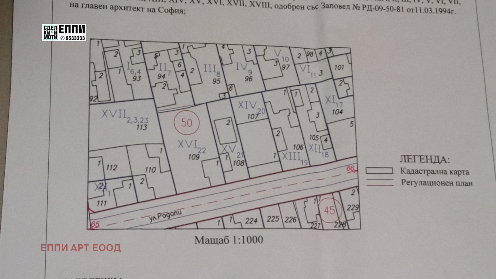 АГЕНЦИЯ 'ЕППИ' продава Урегулиран поземлен имот с площ 335 кв.м с лице на ул. Родопи до кръстовището с ул. Георги С. Раковски . Разполага с всички комуникации: ток, вода, канал. Застрояване на два калкана М+4+МАНСАРДИ, Кинт 3,5, надземно РЗП 1170 кв.м., пл. 60%, кота корниз 19.2 м. ЗП на ет. - 201 кв.м.