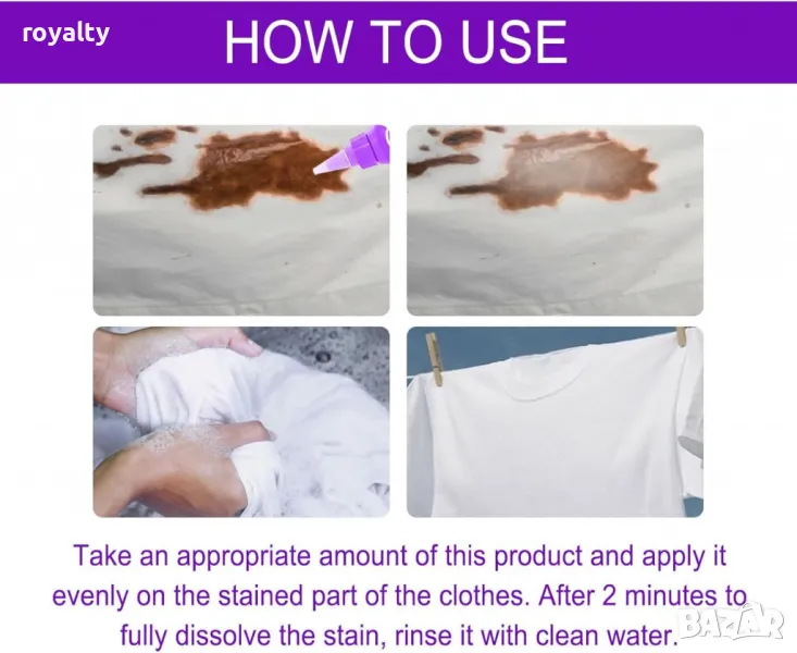 Препоръчителен начин на употреба: Нанесете препарата директно върху петната и след това изперете дрехите на ръка или в пералнята, за да видите резултатите веднага.;