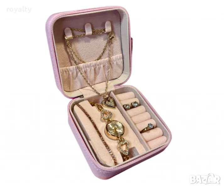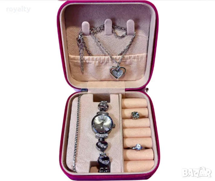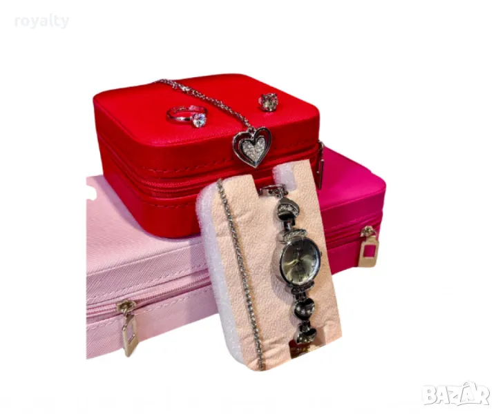Този стилен комплект включва всичко необходимо, за да придаде завършеност на вашето ежедневие и специални моменти. В него ще откриете елегантен часовник с изискана визия, който е съчетан с прекрасно колие, елегантни обеци, шикозен пръстен и изтънчена гривна. Изработен с внимание към детайла и в два изтънчени цвята – сребристо и златисто, този комплект ще допълни всяка тоалет и ще подчертае вашата женственост и стил. Отличен избор за подарък за любимата жена, майка или приятелка – неустоим подарък за всеки повод! Комплекта пристига при Вас в елегантна кутия, затваряща се с цип и отделения за съхранение на бижутата.