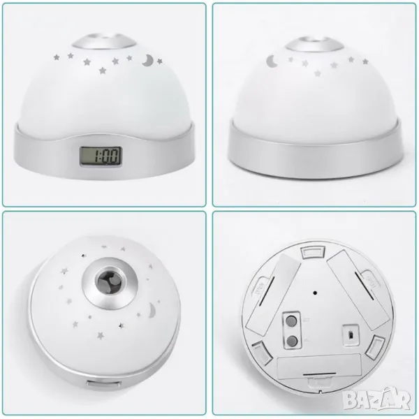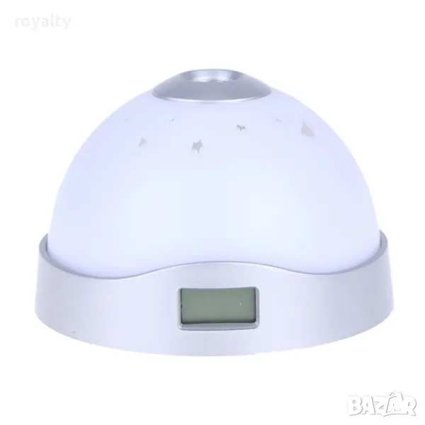 Материал: пластмаса; Формат на времето: 12-часов или 24-часов; Дисплей: показва време, дата и температура (Целзий или Фаренхайт); Проекция: звездно небе с автоматично сменящи се 7 цвята; Захранване: 3 x AAA батерии; Размери: 10 x 10 x 7 см; Лек и компактен дизайн, подходящ за всяка детска стая; Гаранция: 12 месеца.