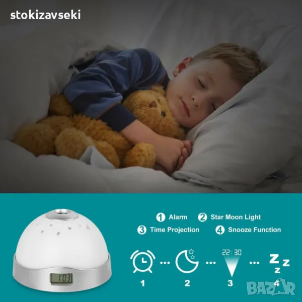 Детска лампа с прожектор „Нощно небе“ – магическа светлина и часовник в едно