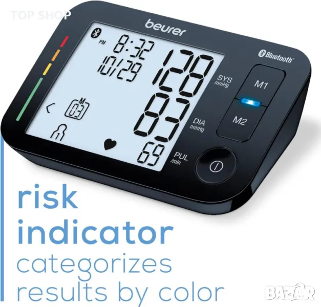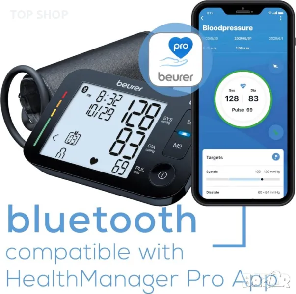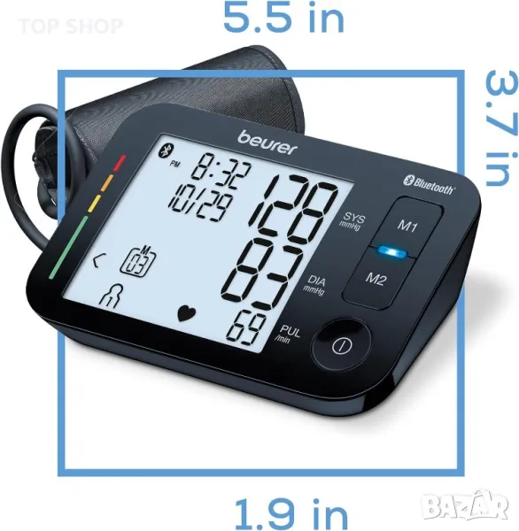 С апарата Beurer BM 54 BT за измерване на кръвно налягане над лакътя, вашите измервания могат да бъдат прехвърлени към смартфон ви чрез Bluetooth®. С приложението „beurer HealthManager Pro“ вашите стойности са веднага под ръка, когато посещавате лекар. Този апарат ви позволява да измервате кръвното си налягане и пулса си бързо и лесно, да запазвате измерените стойности и да проследявате развитието и средните стойности на измерените стойности.
