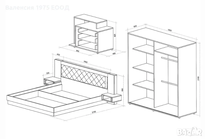 Спалнята е с нощни шкафчета,тапицирана табла с бяла еко кожа, RGB LED осветление с дистанционно управление и повдигащ амортисьорен механизъм за матрак 160/ 200 см. Гардероб с плъзгащи врати,огледала, два лоста за закачалки и четири рафта.