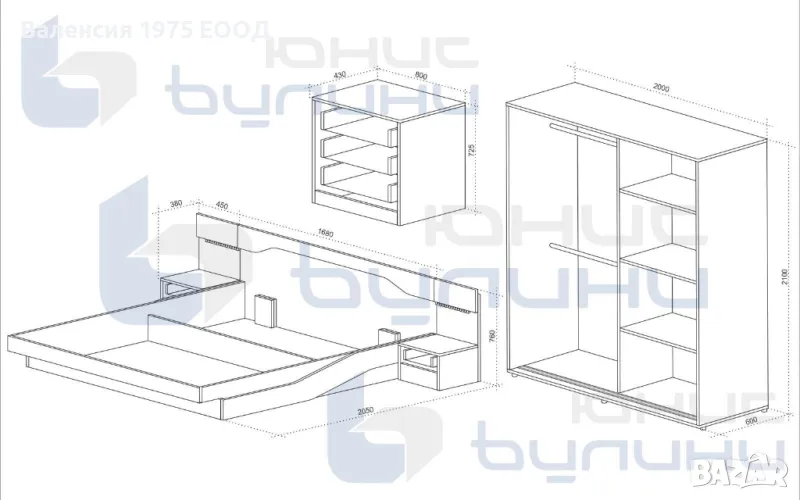 Спалнята е с нощни шкафчета, RGB LED осветление с дистанционно на таблата и повдигащ амортисьорен механизъм за матрак 160/ 200 см. Гардероб с плъзгащи врати, огледало, два лоста за закачалки и три рафта.