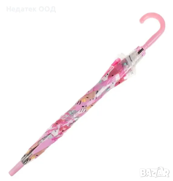 Чадър за дъжд за момиче POE розов, с дизайн на пеперуда и цветни сърца. Има извита дръжка и механизъм за автоматично отваряне.