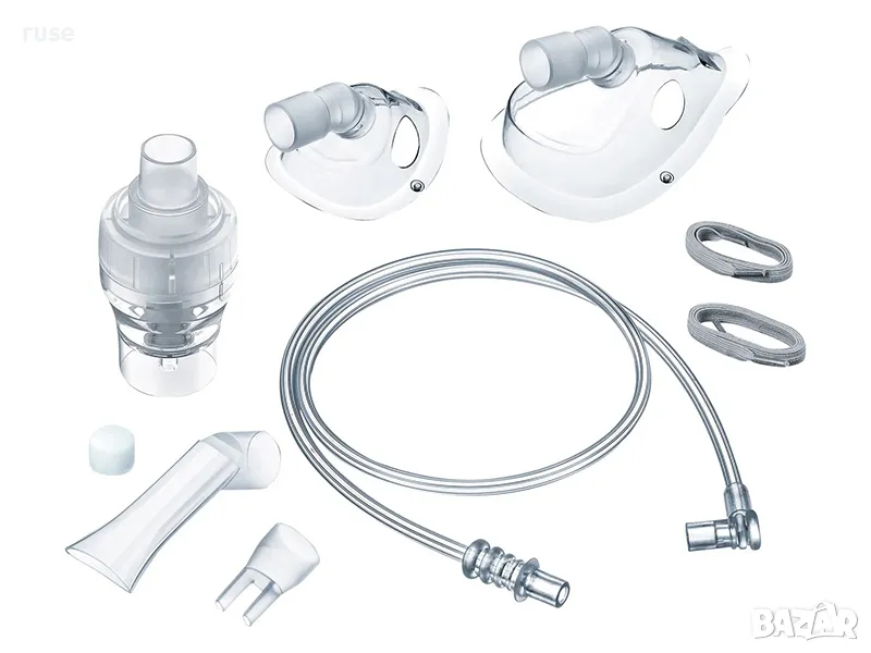 Комплектът съдържа:1x инхалатор, 1x ръководство за употреба, 2 х маски, накрайник за нос, филтър, мундщук, маркуч за сгъстен въздух