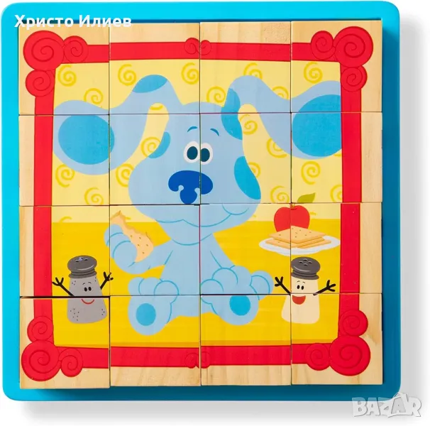 Съберете приятелските лица от "Загадките на Блу"с този красиво изработен дървен пъзел с 16 кубчета! Той може да бъде сглобен по множество начини, за да създадете шест различни сцени с шестима приятели от "Загадките на Блу".